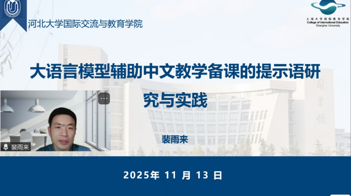 2025年11月13日,为切实提升汉语国际教育专业学生的教学备课能力与技术应用素养,我院组织开展线上专题讲座。本次讲座特别邀请上海大学国际教育学院裴雨来教授主讲,主题为“大语言模型辅助中文教学备课的提升研究与实践”,闫屹院长主持此次讲座。